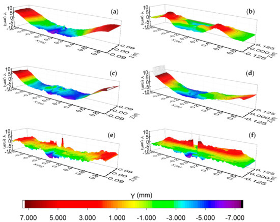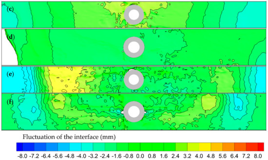 Figure 10. Top view of the contours of the fluctuation at the steel-slag interface, in (a) case 1, (b) case 2, (c) case 3, (d) case 4, (e) case 5, (f) case 6.