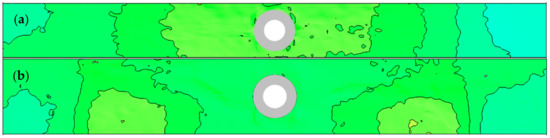 In this study, six working conditions were selected to compare the flow fields in slab molds with two kinds of thicknesses under three different groups of throughputs and argon gas flow rates: low throughput and low argon gas flow rate (Figure 3), high throughput and low argon gas flow rate (Figure 4), and high throughput and high argon gas flow rate (Figure 5). It can be seen that all the calculated results are consistent with the high temperature quantitative measurement results.