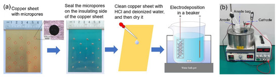 A 100 × 65 × 0.2 mm3 Hull copper sheet is used as the cathode substrate, which is insulated with a plastic film on one side. Micropores of 200 μm are fabricated by laser on the copper sheet, and then a drop insulating glue (Kafuter) is applied on the opening of the micropore on the insulating side of the copper sheet to block the micropore. Before electrodeposition, the copper sheet is immersed in 5%wt HCl solution for 10 min, then rinsed with deionized water, and subsequently dried in hot air. The process from substrate preparation to electrodeposition is shown in Figure 1. For the purpose of this experiment, the substrate is prepared by the above method, and there is no reference preparation standard. The plum blossom nickel (99.8% purity, Inco) is used as the anode, and it is necessary to wrap the anode in a polyester bag because of a long deposition time.