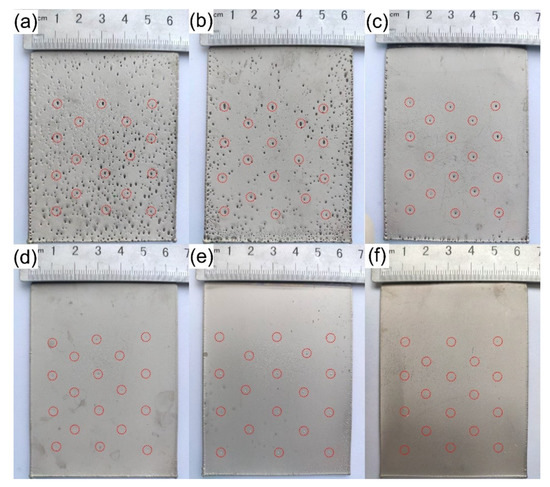 SDS is a common surfactant, which can effectively reduce the surface tension of the solution, leading to reduced adhesion energy to promote the desorption of bubbles from the cathode surface. The morphology of the nickel layers prepared in the electrolyte with different contents of SDS is directly observed by digital photos. As shown in Figure 2, the contents of SDS in Figure 2a,b are 0.0020 and 0.0040 g/L and there are a large number of pores on the deposition, in which the pores encircled by dotted red lines are desired and the rest are pinhole defects. With the increase in the SDS content, the number of pinholes decreases in Figure 2a–f. This is because the adhesion area of the bubbles attached to the cathode surface is small, because of which the bubbles are easy to desorb as the surface tension of the solution decreases. However, the adhesion interface of the bubbles attached to the micropores in the micropore section is larger than the adhesion interface of the bubbles attached to the smooth surface, so the bubbles attached to the micropores are difficult to desorb.