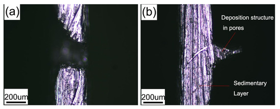 According to the experimental phenomenon, the formation process of desired bell-mouthed macropores in the deposition is speculated and shown in Figure 4. When the copper sheet is immersed in the solution, the solution with a high surface tension cannot wet the micropores and a part of the gas remains in the micropores (Figure 4b). The hydrogen micro-bubbles generated on the surface of the cathode detach and dissolve in the solution [31], and some of them are merged with the gas in the micropores [8] (Figure 4c) as the solution flows through the surface of the gas, so the gas volume in the micropore gradually grows to be bubbles, as shown in Figure 4d. However, nickel ions are continuously deposited on the substrate and this process makes the deposition “climb” along the bubbles, which reduces the buoyancy of the bubbles and provides an additional adhesion area to the bubbles, and both of these effects help the bubbles stay attached to the substrate rather than desorb. It can be seen that unlike the dynamic hydrogen bubble template, the bubble template in Figure 4 is relatively static and can remain attached all the time to provide a steady template for metal deposition. Because the deposition is along the surface of the bubble template, when the contact angle between the bubbles and the surface of the deposition is an obtuse angle, a bell-mouthed macropore will be formed in the deposition. In addition, due to the buoyancy of the bubbles, the bell-mouthed macropores in the deposition are inclined upward. It should be noted that the size of the micropores on the substrate is an important parameter that affects the formation of the bubble template. In the previous discussion about the attachment of bubbles onto the surface of the substrate, the size of the micropores was larger than the attachment interface of the bubbles on the flat area, which is conducive to the adhesion of the bubbles at the micropores. However, according to the explanation of the bubble template formation process, it can be reasonably assumed that when the diameter of the micropore is too large, the solution will wet the inside of the micropores and the desired bubble template will not form. Therefore, the effect of micropore size on the formation of the bubble template is complicated.