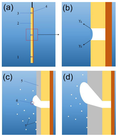 The formation process of bell-mouthed macropores in the deposition: (a) the substrate is placed in the solution; (b) state of micropores before electrodeposition; (c) electrodeposition begins and macro-bubbles are formed; (d) bubbles and deposition in electrodeposition. (1, bath solution; 2, Hull copper sheet; 3, micropore on the copper sheet; 4, insulating layer; 5, nickel deposition; 6, micro-bubbles merging with bubbles on the cathode; 7, micro-bubbles generated on the cathode and dissolved in the solution).