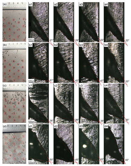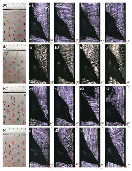 Cut the bell-mouthed macropores along the vertical symmetry axis of the macropore edge to observe their cross-sectional morphology. The cross section of the bell-mouthed macropores obtained in this way is the largest and can accurately reflect the evolution of the entire macropore. Figure 5(a1–a4,b1–b4,c1–c4,d1–d4) show the morphologies of bell-mouthed macropores at stirring speeds of 240, 320, 400, and 480 r/min, respectively. It can be seen that the bell-mouthed macropores from a to d increase significantly. In Figure 5, the extended contour line measures the opening angle of the bell-mouthed macropores, and the angle values are listed in Table 2. As the solution stirring speed increases from 160 to 480 r/min, the angle range of the bell-mouthed macropore cross-sectional profile is increased from 21.0° to 44.3°. Although the angle ranges under different current densities partially overlap, in general, the bell-mouthed macropores become larger with an increase in the current density. Because the increase in stirring speed makes the flow velocity of the electrolyte on the cathode surface increase, the bubbles attached to the bell-mouthed macropores capture more hydrogen micro-bubbles dissolved in the solution, thereby accelerating their growth. Thus, the bell-mouthed macropores become larger.