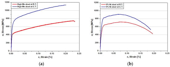 - In the tensile test results, the effect of temperature was confirmed based on the minimum value of ultimate tensile strength. As the temperatures of the high-Mn steel and 9% Ni steel decreased, the yield strengths increased by 40% and 20%, respectively, and the tensile strengths increased by 51% and 30%, respectively. This indicates that the mechanical properties of both steels are excellent at low temperature. In addition, high-Mn steel and 9% Ni steel both satisfy the mechanical properties recommended by DNV rules in terms of the minimum value of yield strength.