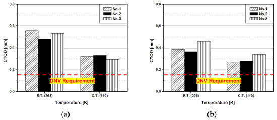 - After performing the CTOD test according to BS 7448, the CTOD values of all weld metals decreased at cryogenic temperatures. This is attributed to the fact that the fracture resistance of the weld metals decreases under the influence of temperature. In addition, all CTOD values of weld metals at room and cryogenic temperature met 0.15 mm, thus satisfying the values recommended by DNV.