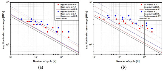 - For the fatigue test results, the S-N curve of butt joints with plasma arc welding is observed to satisfy the IIW FAT 80 class. Comparing fatigue strength, that of high-Mn steel was found to be about 5% higher at room temperature; meanwhile, at cryogenic temperature, the fatigue strength of 9% Ni steel was about 20% higher than that of high Mn steel. In addition, the fatigue data of 9% Ni steel at cryogenic temperature showed the highest standard deviation.