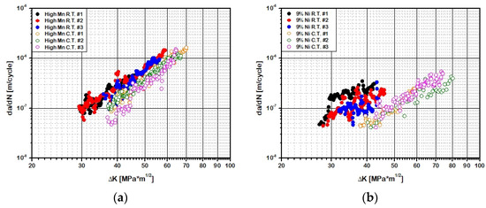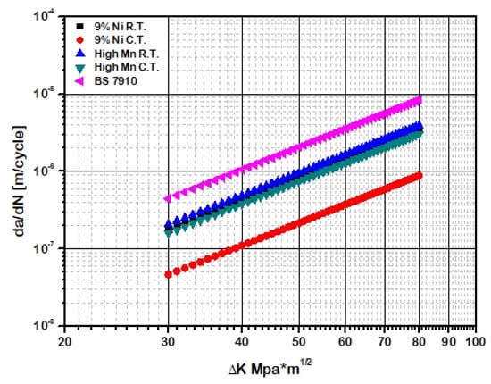 - ASTM E647 suggests that data are valid when the angle between the crack generated through the FCGR test and the preliminary fatigue crack is less than 10°. The angles of cracks generated through this test were all less than 10°, and the design curves of high-Mn steel and 9% Ni steel both satisfy the crack growth rate criteria for austenitic steels presented in BS 7910.