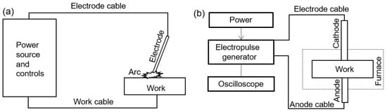 A schematic diagram of EAW is shown in Figure 1a. The power source provides either a direct current or an alternating current. The electrode can be either consumable or non-consumable. The electric arc is ionised air with high electrical conductivity, similar to that of the metals. The workpieces are mainly metallic materials, e.g., low-carbon steels. Figure 1b illustrates a typical experimental setup for investigating the electric effect in materials processing. The major difference between Figure 1a,b is the minimisation of Joule heating. This is achieved by minimising the contact resistance and replacing the continuous current with electric pulses. The required temperature in Figure 1b is provided by a well-controlled furnace. The electric effect is considered based on the adiabatic assumption. The heat effect can add to the electric effect without interference. The temperature-dependent electrical properties have been counted in the consideration of the electric effect. The device shown in Figure 1b can be considered as a model device for Figure 1a with the capability of investigating individual phenomena at various areas in the HAZ.