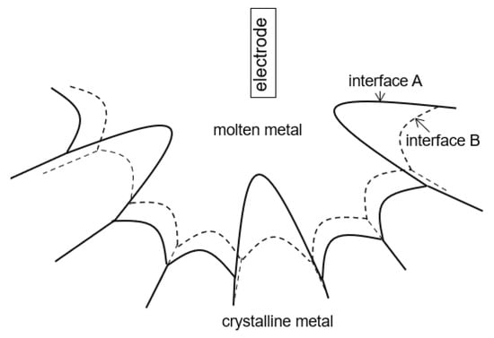 From a thermodynamic point of view, the electric effect promotes microstructure evolution toward the state with the highest electrical conductivity []. It is well known that the crystalline phase has a higher electrical conductivity than the corresponding liquid and amorphous phases []. This indicates another growth that is due to the percolation effect of the electric current, as illustrated in Figure 2. The interface represented by the solid line (denoted as interface A) is encouraged by the electric effect more than the interface represented by the dashed line (denoted as interface B). Both cases have the same fraction of the solidified phase, but interface A has some grains grow faster than others and eventually form large anisotropic-shaped crystals. The case where some of the grains grow quickly toward the electrode causes the formation of several high-conductivity percolation paths and enables the electric current free energy to be lower than that of the case illustrated in interface B. The percolation-caused growth is detrimental to the quality of the weldment because those large grains can form an interconnected frame to reduce the fluidity of the unsolidified metal. The latter causes the formation of defects, pores, residual stress and hot cracks [] because the volume shrink during cooling in the isolated areas is unable to be refilled by other liquid metals. For a similar thermodynamic reason, aligned growth can take place in electric processing [,]. This is because the different phases have different electrical conductivities. An aligned microstructure promotes percolation and maximises the material’s effective electrical conductivity along certain orientations. The electric effect can also cause the anisotropic objects to rotate in the liquid phase. Numerical calculations have shown that the needles [] and thin flakes [] of the low-electrical-conductivity phases in a high-conductive liquid can rotate and eventually align to the direction of the electric field.