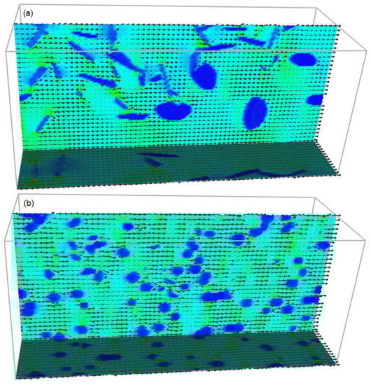To illustrate this straightforwardly, a numerical calculation for the current density distribution was performed and the electric current free energy was calculated according to Equation (2). These results are shown for the first time, as follows. The numerical data were plotted using MatVisual software. The electric current density was obtained by first calculating the static electric potential distribution and then using Ohm’s law to calculate the electric current. The static electric potential distribution was calculated by a relaxation method and Kirchhoff’s law. The virtual system was subjected to an electric potential difference of 20 V in a horizontal direction. The electrical potential in the left end was higher than that in the right end. The material contained two phases. The matrix had a higher electrical conductivity than that of the embedded phase. For a realistic calculation, the physical parameters of ferrite (electrical conductivity at and magnetic permeability 300μ0) were used for the matrix, and the physical parameters of cementite (electrical conductivity at and magnetic permeability 30μ0) were used for the embedded phase. The calculation was performed on a lattice containing 201 × 91 × 81 number of cubic grids. The electric current distribution is shown in Figure 3. The grains at flat shapes shown in Figure 3a are broken and spheroidised in Figure 3b. The numerical calculation shows that the electric current free energy in Figure 3b is much lower than that in Figure 3a. The electric effect has promoted the formation of a finer microstructure.