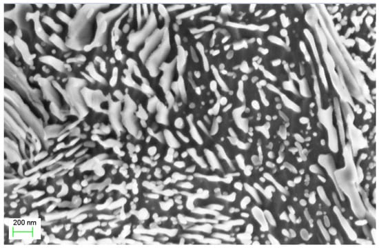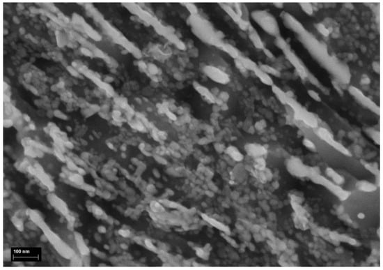 For the materials containing residual stress, the recrystallisation-induced residual-stress mitigation means a negative value of strain–stress energy (). The release of the residual strain–stress energy can contribute to the microstructure evolution in recrystallisation and makes the grains even finer. The residual stress is often formed during the phase transition, quenching and mechanical deformation. The combination of the electric effect and the residual stress effect has been implemented to fabricate nanostructured steels [,]. Electric current pulses were applied at around 109 A/m2 to a cold-drawn high-carbon pearlitic-steel wire (Fe–0.8C–0.2Si–0.5Mn wt.%) to 60% elongation and obtained very fine cementite particles. Figure 4 shows a scanning electron microscope (SEM) image after recrystallisation of this wire. The figure is shown for the first time in the present work. Spheroidized nanoscale FeC3 particles are seen throughout the image, while the original microstructure before recrystallisation was a deformed lamellar pearlite. It is not possible to form such fine grains by rearrangement of the interface energy alone. The electric effect and residual stress have both played their roles.