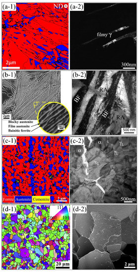 Microstructure of different AHSS containing the metastable austenite grains, including the (a) Q&P steel [56], Reprinted with permission from ref. [56]. Copyright 2018, Elsevier. (b) CFB steel [57,58], Reprinted with permission from ref. [57,58]. Copyright 2015, 2017, Elsevier. (c) medium Mn steel [59,60], Reprinted with permission from ref. [59,60]. Copyright 2019, 2021, Elsevier. and (d) TWIP steel [61,62]. Reprinted with permission from ref. [61,62],. Copyright 2015, 2016, Elsevier. (a-1) and (c-1) are EBSD phase map; (b-1) is SEM image; (d-1) is EBSD orientation map; (a-2) to (d-2) are TEM images. Red color and blue color in (a-1) represent the martensite and austenite, respectively. ND: normal direction. γG: granular austenite; γL: lamellar austenite; α: ferrite.