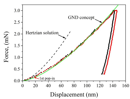 The typical Hertzian elastic contact solution fitted to the P-h curve of the retained austenite grains in medium Mn steel is shown in Figure 2. The discontinuity (strain burst or pop-in) coincides with the deviation of the P-h curve from the Hertzian elastic contact solution in the load-controlled nanoindentation test (Figure 2). Note that both strain burst and load drop are observed for the displacement-controlled mode owing to the machine compliance [74].