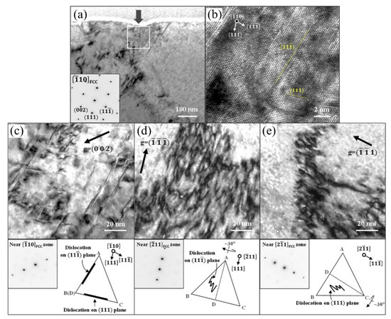 (a) TEM bright-field image depicting the defect structure in the austenite grain beneath the indenter. The lower left inset is the selected area diffraction pattern. (b) High-resolution TEM (HRTEM) image displaying the presence of dislocations along the different slip planes. (c–e) Magnified view of the rectangle in (a), showing the dislocations under different two-beam conditions. The schematic illustration as shown in (c–e) are the tetrahedron demonstrating the orientation of {111} slip plane, and the perfect dislocations on different slip planes [81]. Reprinted with permission from ref. [81]. Copyright 2017, Elsevier.