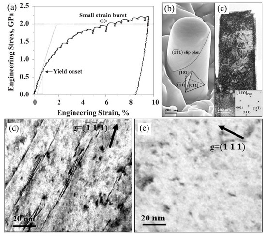 (a) Engineering stress–strain curve of austenite micro-pillar compressed along [111] crystal orientation. (b) The corresponding SEM micrograph of the austenite micro-pillar after the compression test. The inset in (b) is a tetrahedron indicating the orientation of the {111} slip plane. (c) TEM bright-field image displaying the formation of intensive dislocations in the pillar after compression test. (d) Magnified view of the rectangle in (e) showing the perfect dislocations along the (-1 -1 1) slip plane. € TEM BF image of the same region with different beam -direction [81]. Reprinted with permission from ref. [81]. Copyright 2017, Elsevier.