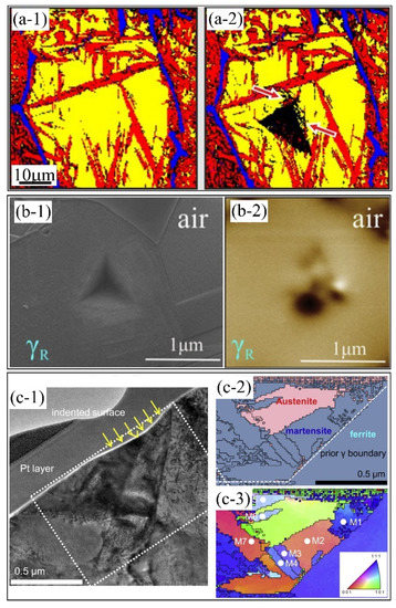 The detection of the martensitic transformation during the nanoindentation test using different techniques, including the (a) EBSD measurement [106], Reprinted with permission from ref. [106]. Copyright 2020, Elsevier; (b) MFM [105], Reprinted with permission from ref. [105]. Copyright 2019, Elsevier; and (c) FIB-TEM/EBSD [94], Reprinted with permission from ref. [94]. Copyright 2015, Elsevier. (a-1) EBSD phase maps before and (a-2) after indentation test. Red color, yellow color and blue color in (a) represents the martensite, austenite, and cementite respectively. (b-1) SEM image; (b-2) MFM image; (c-1) TEM image; (c-2) EBSD phase map; (c-3) EBSD IPF map. Note that the MFM as shown in (b-2) confirms the free of martensitic transformation in the dual-phase stainless steel.