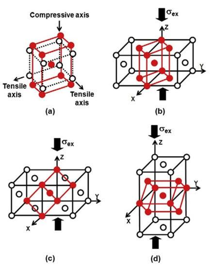 (a) Schematic illustration for the arrangement of atoms during the martensitic transformation according to the Bain distortion mechanism. (b–d) Three possible Bain variants concerning the loading direction [99]. σex: externally applied stress. Black circle and red dot represent the austenite and martensite atoms, respectively. Reprinted with permission from ref. [99]. Copyright 2010, Elsevier.