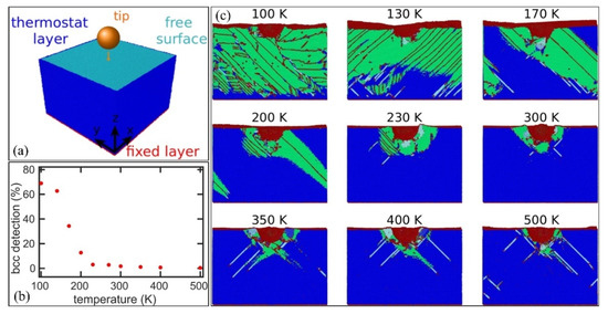 The nano-mechanical behavior of the austenite at different temperatures is investigated by the molecular dynamics (MD) simulation (Figure 8a,b) [113]. It is found that the martensitic transformation dominates over the whole austenite grain during nanoindentation investigation at a deformation temperature of 100 K (Figure 8c). The increase of deformation temperature reduces the amount of transformed martensite which is mainly confined to the area surrounding the indenter (Figure 8b,c). The remaining austenite is deformed by dislocation plasticity. No deformation twinning is observed for the warm-temperature deformation of austenite (500 K) (Figure 8c). Although the molecular dynamics investigation is effective to reveal the deformation behavior at different temperatures, the MD simulation involves a very high strain rate (20 m/s) [113], which cannot be achieved by the conventional loading rate of the nanoindentation test. Moreover, the austenite grain boundary is fixed, which limits transformation at the area close to the fixed boundary (Figure 8c).