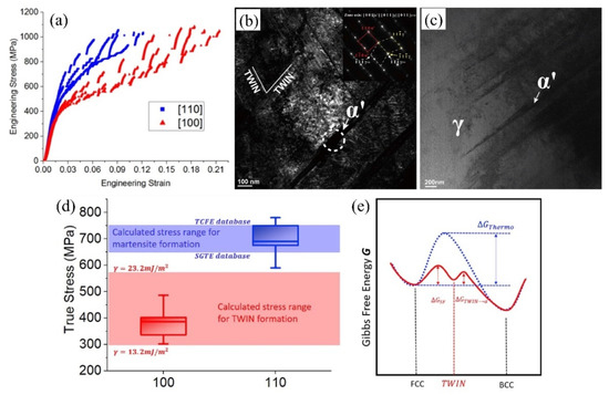 (a) Engineering stress–strain curves of the austenitic pillars with different orientations in medium Mn steel (Fe-9Mn-0.6C in wt.%). TEM images show the microstructure in deformed austenitic pillars with the orientation of (b) [100] and (c) [110]. The nucleation process of the martensite at the intersection of the stacking faults/twins in the micron-pillars with the orientation of [100]. (d) The calculated critical stress for triggering the deformation twins and martensite. (e) Schematic illustration of the different transformation pathways in the micro-pillars with varied orientations [86,87]. Reprinted with permission from ref. [87]. Copyright 2019, Elsevier.