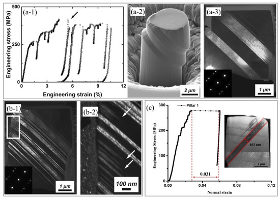 The micron-pillar compression test of the single austenitic crystal shows that there is an obvious strain burst in the flow curve (Figure 10(a-3),c). The contribution of the deformation twins to the engineering strain can be estimated as below [70]: