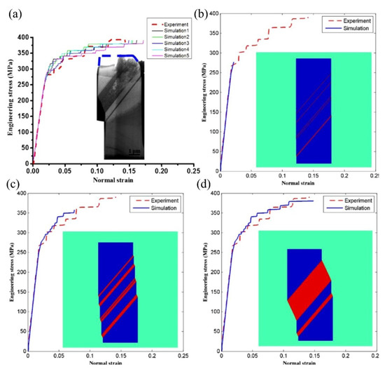(a) The comparison between the simulated stress–strain curves and the one obtained by experiments. The inset shows the formation of twins in the austenitic pillar after the compression test. (b–d) The simulated stress–strain curve at different engineering strains together with the corresponding morphology of deformation twins [70]. The red color in (b–d) represents the deformation twins. Reprinted with permission from ref. [70]. Copyright 2015, Elsevier.