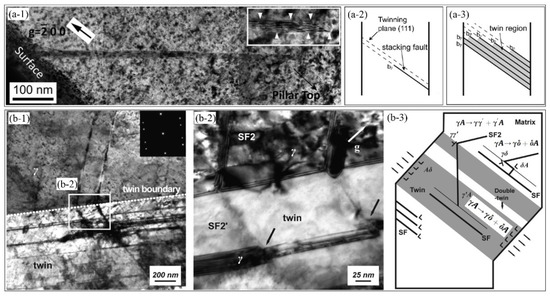 (a-1) The bright-field TEM image depicting the formation of nanometer-sized deformation twins in the micro-pillar generated by emission and glide of stacking faults from pillar surface after the compression test. (a-2,a-3) The schematic illustration of the nucleation of deformation twins by emission and glide of stacking faults in the micro/submicron-austenitic pillar []. Reprinted with permission from ref. [142]. Copyright 2012, Elsevier. (b-1,b-2) The bright-field TEM image demonstrating the generation of complex deformation twins in the austenitic pillar with a diameter of 10 μm. (b-3) The schematic illustration of the nucleation of complex deformation twins [74]. Reprinted with permission from ref. [74]. Copyright 2017, Elsevier.