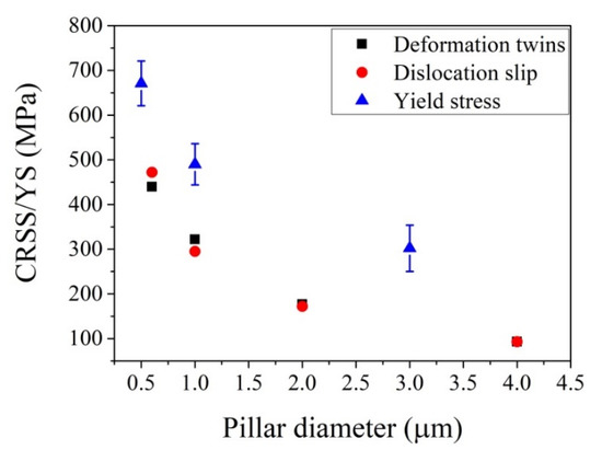 Critical resolved shear stress (CRSS) or yield stress (YS) for twinning and slip in small-sized single-crystal pillars (Fe-22Mn-0.6C in wt.%). The data are extracted from studies [90,144].