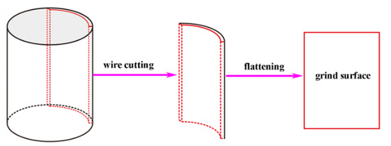 The gradient structure and microstructure after compression deformation were observed by optical microscope (OM, Zeiss Axio vert A1, Germany) scanning electron microscope (SEM, JSM-6700F, JEOL, Tokyo, Japan), field emission SEM (GeminiSEM 500, Zeiss, Oberkochen, Germany) equipped with an electron backscatter diffraction detector (EBSD, Oxford Symmetry, Oxford, UK), and a transmission electron microscopy (TEM, FEI Tecnai G2 F30, Hillsboro, OR, USA). The samples for the EBSD test were grounded with abrasive papers first and then electropolished in a solution consisting of 94 vol.% glacial acetic acid and 6 vol.% perchloric acid (HClO4) at ~60 V for 15 s. The obtained EBSD data was analyzed by AZtecCrystal 2.0 software (Oxford Instrument, Oxford, UK). The TEM sample cutting location and preparation process refer to reference [23]. The schematic diagram of the TEM preparation process is shown in Figure 1. TEM samples were mechanical grinding down to about 50 μm, and then electropolished in a solution consisting of 60 vol.% methanol, 35 vol.% butyl alcohol and 5 vol.% perchloric acid at 30 V and −30 °C by twin-jet electrochemical polisher. TEM experiments were carried out at a voltage of 200 kV.