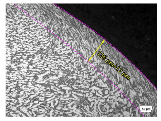 Figure 2 shows the microstructure of the surface layer of GS Ti64. A circle of obvious plastic deformation layer is formed on the surface, and the microstructure presents an obvious gradient distribution. The microstructure near the surface is severely refined and the primary α phase elongates along the rolling direction. The obvious deformation layer depth of the Ti-6Al-4V alloy induced by USRP is 126 μm ± 12 μm.