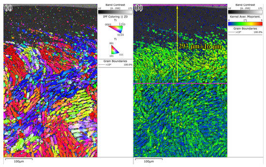 In order to further analyze the gradient structure, EBSD is used to characterize the GS Ti64, as shown in Figure 3. It can be seen from the IPF map (Figure 3) that the region close to the surface shows a black zero resolution area due to severe plastic deformation. Although only the grains near the surface are significantly refined, the color of the grains farther away from the surface is changed, indicating that the USRP causes crystal rotation of the grains farther away from the surface. KAM (kernel average misorientation) value decreased gradually with the increase of the distance from the surface, presenting a gradient distribution (Figure 3b). The KAM value near the surface is high and the distribution is relatively uniform, while the KAM value far away from the surface is unevenly distributed. Local plastic deformation occurred inside the α phase, and the KAM value near the interface is higher. The depth of the plastic affected zone caused by USRP is 293 μm ± 16 μm.