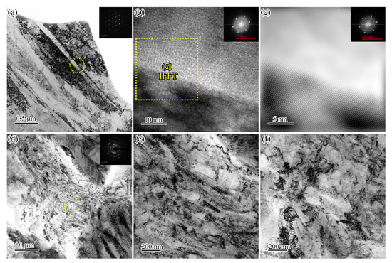 TEM is used to observe the microstructure of GS Ti64 at a distance of about 20 μm from the top surface. Figure 4a shows the formation of some lamellar structures, and the SAED (selected area electron diffraction) pattern derived from the circle region in Figure 4a shows that the lamella has an HCP structure (as shown in the inset of Figure 4a). The HRTEM micrograph shows a clear interface between the lamellae and the matrix. However, the IFFT (inverse fast Fourier transition) result of the yellow square area in Figure 4b shows that the crystal structure of the lamellae is the same as the matrix. The crystal lattice at the interface is complete, but a certain degree of lattice distortion has occurred, indicating that the different degrees of deformation in different regions result in the formation of lamella with low angle grain boundaries (Figure 4c). Figure 4d shows that the large block structure of α phase forms substructures such as dislocation cells and deformed bands. Fine grains are formed in the βt, the diffraction spots are a series of diffraction rings, indicating the formation of randomly oriented ultrafine/nanocrystal crystals. The enlarged view of the βt region shows that it is composed of an ultrafine lamellar structure (Figure 4e) and an ultrafine equiaxed crystal structure (Figure 4f).
