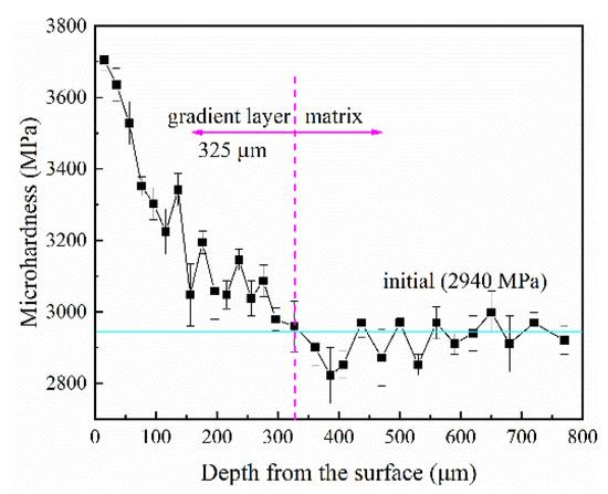 The microhardness of the cross-section of the GS Ti64 sample changes with the depth, as shown in Figure 5. The microhardness gradually decreases from the surface to the core. The thickness of the entire gradient deformation layer reaches 325 μm, and the hardness of the topmost layer is about 26% higher than that of the CG matrix. USRP causes severe plastic deformation and grain refinement on the surface of Ti-6Al-4V, resulting in increased hardness. With the increase of the distance from the surface, the degree of plastic deformation and grain refinement gradually weakened, resulting in a gradual decrease in hardness.