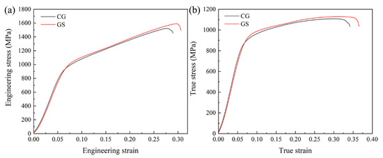 Figure 6 shows the engineering and true stress-strain curves of CG Ti64 and GS Ti64. During the compression process, the experiment is stopped when the sample is damaged. The engineering stress of both firstly increases and then decreases with the increase of strain. The fracture strain of GS Ti64 is about 6% higher than that of CG Ti64 (Figure 6a), suggesting that GS Ti64 has better compressive plasticity. The compressive strength of GS Ti64 (1590 MPa ± 22 MPa) is higher than that of CG Ti64 (1520 MPa ± 15 MPa), indicating that the gradient structure improves the compression resistance of Ti-6Al-4V. Figure 6b exhibits that the true stress of both increases rapidly with the increase of strain at the initial stage of deformation, and then increases slowly to the peak stress and then decreases gradually until fracture. The true stress value of GS Ti64 is slightly higher than that of CG Ti64.