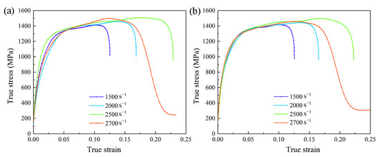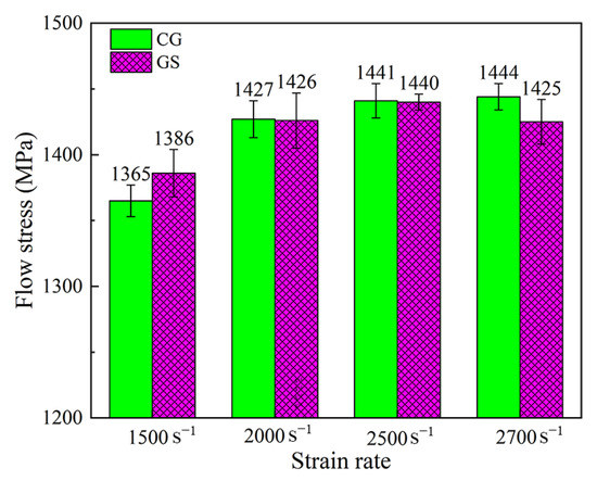 The average flow stress values of CG Ti64 and GS Ti64 at different strain rates are shown in Figure 8. When the strain rate is 1500 s−1, the true stress of GS Ti64 is slightly higher than that of CG Ti64, and the average flow stress increases from 1365 MPa of CG Ti64 to 1386 MPa of GS Ti64. The average flow stresses are almost equal when the strain rates are 2000 s−1 and 2500 s−1. It’s worth noting that the average flow stress of GS Ti64 is less than that of CG Ti64 under 2700 s−1, which is due to the stronger dynamic softening effect of GS Ti64 than CG Ti64.
