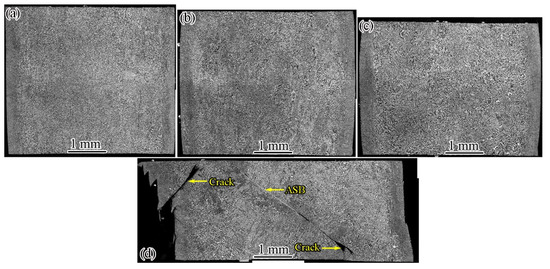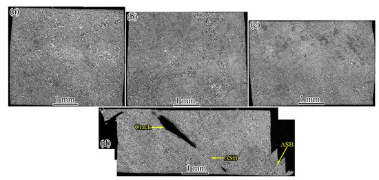 Microscopic metallographs of longitudinally sectioned samples of CG Ti64 and GS Ti64 after compression at different strain rates are shown in Figure 9 and Figure 10, respectively. CG Ti64 and GS Ti64 maintain uniform compression deformation at 1500 s−1, 2000 s−1 and 2500 s−1, and no ASB is generated. When the strain rate increased to 2700 s−1, some saw-tooth chips formed at the two end faces of CG Ti64, coarse crack formed on the left side of the specimen, and multiple ASBs were formed on the right side (Figure 9d). By contrast, one side of the GS Ti64 sample produced some saw-tooth chips and formed a crack. The width of the crack gradually widened from the surface to the internal, the crack tip was passivated in the coarse grain region. Only one ASB was produced on the other side (Figure 10d). In addition, CG Ti64 formed a large crack and the cracks were fully opened (Figure 9d), while GS Ti64 formed small cracks (Figure 10d) in the middle of the sample, indicating that GS Ti64 has better resistance to failure. The above deformation features indicate that coordinated deformation occurs between the gradient structure and the coarse grains of the core, which prevents the premature failure of the sample.