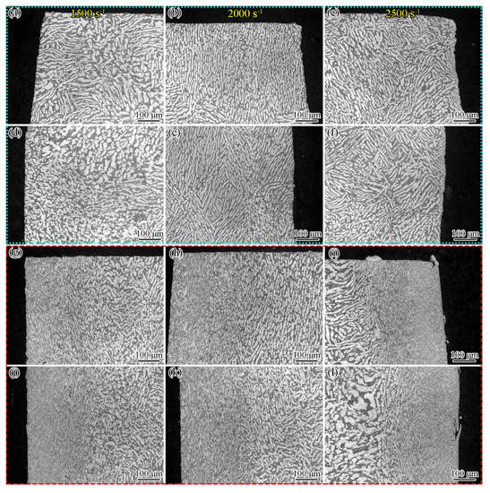 The microstructures of the upper and middle regions near the sample surface of the cross-section of CG Ti64 and GS Ti64 samples after compression deformation at 1500 s−1, 2000 s−1 and 2500 s−1 are shown in Figure 11. It was found that the side expansion of CG Ti64 is obvious (Figure 11a–f), while the side of GS Ti64 is relatively straight (Figure 11g–l), indicating that the gradient structure hinders the lateral expansion of the sample, resulting in more uniform compression deformation. It was also found that cracks appear on the surface of 2500 s−1 compression deformation (Figure 11l), indicating the difficult deformation characteristics of the surface gradient structure, which is consistent with the high hardness of the surface.