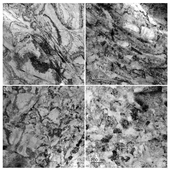 TEM images of GS Ti64 samples at a depth of about 20 μm from the surface before and after compression: (a,b) before compression; (c,d) after compression.
