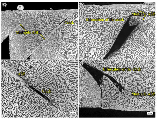 ASB morphology of GS Ti64 after 2700 s−1 dynamic compression deformation: (a) formation of multiple ASBs; (b) bifurcation of crack; (c) crack propagation along the ASB; (d) multiple ASBs are formed at the crack tip.