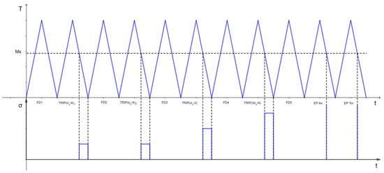 Similar to FD tests, TRIP tests also consist of subjecting a specimen to a thermal cycle leading to the same transformations just mentioned. However, the key difference between the FD tests and the TRIP tests is that during the TRIP tests, the test specimen is also subjected to the aforementioned external stress, provoking said anomalous plastic strain. The external stress is applied just before the starting temperature (Ms) of the transformation during cooling and maintained constant during the whole transformation [4].