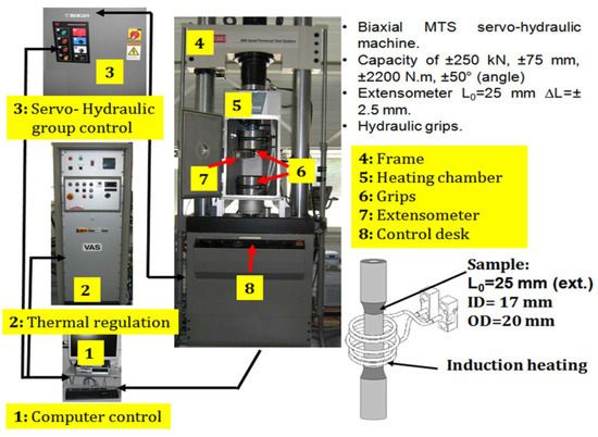 In order to carry out the experiments, the device, which is a Series 809 Axial/Torsional Test System (MTS, Minneapolis, MN, USA) presented in Figure 2 is used. It is composed of 2 main parts: The part for thermal loading, and the part for mechanical loading.