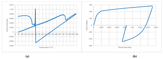 In order to conduct correct TRIP tests where the applied stress is lower than the yield stress of the austenitic phase in the temperature interval of the transformation, we need to have an idea about the yield limit at an adequate temperature. For this, we have performed a thermomechanical characterization at about 300 °C just before the onset of the martensitic transformation, namely, during cooling, when the temperature reaches 300 °C, a loading–unloading cycle is applied quickly (with a duration of about 2 s). An example of the cycle carried out in the axial direction can be seen in Figure 4 where the yield stress of the austenitic phase may be estimated at about 160 MPa. Therefore, in order to be sure that the applied loading in our tests is in elasticity, we assume that the yield limit is around 120 MPa. The conditions of determination of this stress–strain diagram can be assumed to be isothermal regarding the small variation of temperature (less than 10 °C) during the application of the cycle (about 2 s).