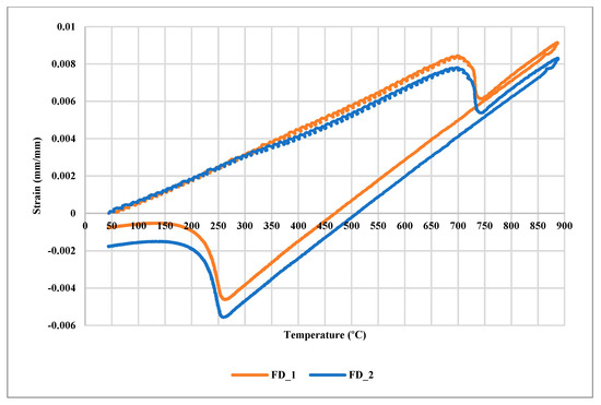 FD tests consist of subjecting a test specimen to a thermal cycle, which leads to the transformation of the (ferritic) phase into the (austenitic) phase during heating, followed by the transformation of the phase into the phase during cooling. During FD tests, the test specimen is only subjected to temperature variation and no inelastic strain is observed at the end of the transformation [3,4,5].