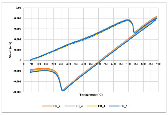 However, taking a look at Figure 6, we see that, despite applying more TRIP tests, even for cases in which the stress applied to the specimen is higher, the following FD results (FD_3, FD_4, and FD_5) are almost superimposed. Therefore, FD_2, FD_3, FD_4, and FD_5 may be taken as references that may be used for the determination of TRIP.