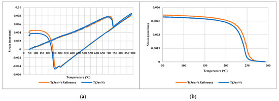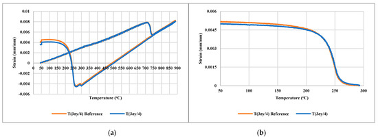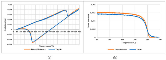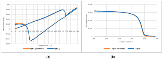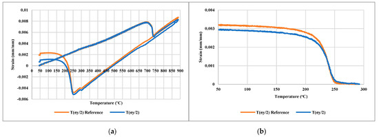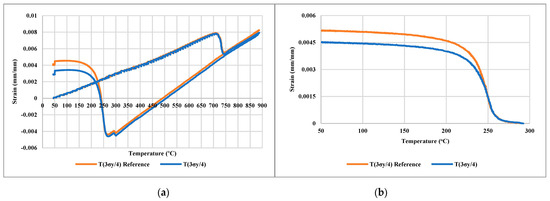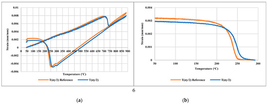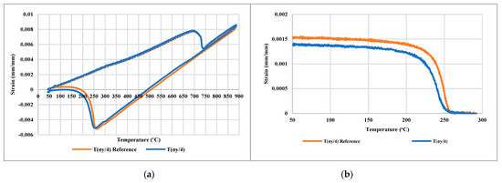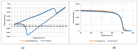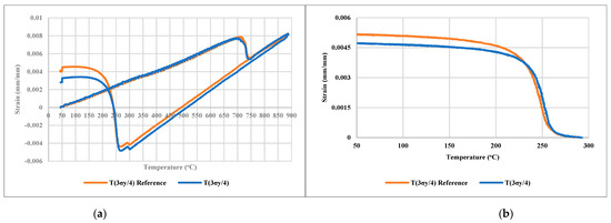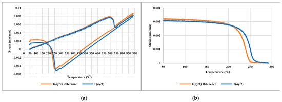 Equation (5) is estimated from thermal strain evolution vs. temperature (Equation (4) deducted from free dilatometry test) by assuming the linear mixture rule to obtain the thermal strain of the phases mixture [4]. The thermal strain can be expressed by