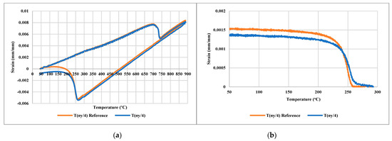 (a) Complete thermomechanical cycle comparison between and defined in Table 10; (b) TRIP strain vs. temperature comparison between and .