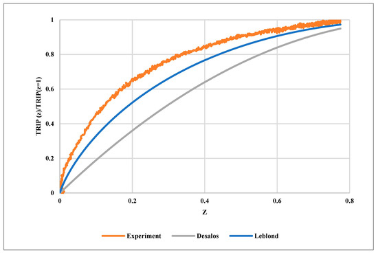 In Figure 20, we present the TRIP evolution of the case presented in Section 3.1.2 vs. the volume proportion determined from the FD test applied just before it. However, as we saw in the previous section, there are expressions such as Desalos’ and Leblond’s models that allow us to obtain this relation as well. Therefore, we predict the same relation using Desalos’ and Leblond’s models and compare it to our results.