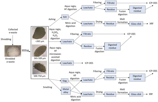 E-waste samples were fused with borax in alumina crucibles in a muffle furnace at 1350 °C. Following smelting, the metal phase was separated from slag, and both phases were subsampled for both XRF (AM1) and ICP-OES (AM2) analysis. Sample pre-processing using smelting was chosen as it allowed for a larger sample size (50 g) and the removal of any combustible organic substances such as BFR and plastics during the high-temperature processing. The resulting ceramics and metals were separated after the smelting process by screening the sample based on size. This was done to simplify the acid digestion step by reducing the amount of metal bound to ceramics, plastics, and silicates [16].