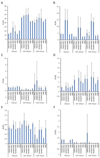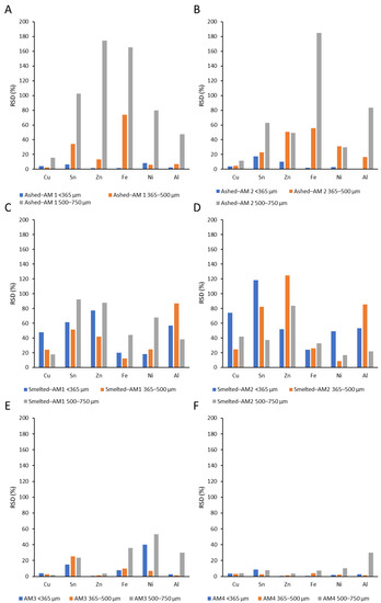 The RSD of PCB metal contents as determined by (A) ashing and AM1, (B) ashing and AM2, (C) smelting and AM1, (D) smelting and AM2, (E) AM3, and (F) AM4 for each particle size fraction. Error bars show standard deviations between three replicate samples.
