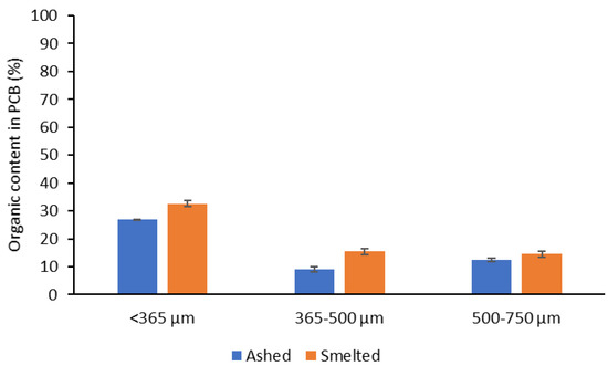 One method to achieve a more homogeneous sample is to further reduce the particle size of the material. However, PCBs have a limit on how effectively size reduction can occur. The smallest size that PCBs can typically be reduced to without extensive treatment is 250 μm [50]. This is largely due to the physical properties of the particles, with plastics being more brittle and metals typically being more ductile and malleable. The plastic content also typically increases with the reduction in the size of the fragment, as observed in this study (Figure 4). Smelting and ashing allowed the calculation of organic material content through loss on ignition (LOI) as the organic components were combusted. The largest LOI was detected in the smallest particle sizes (Figure 4).