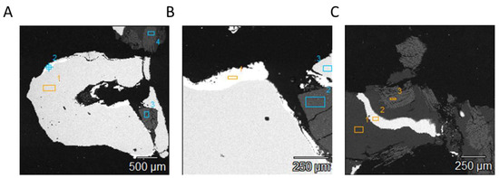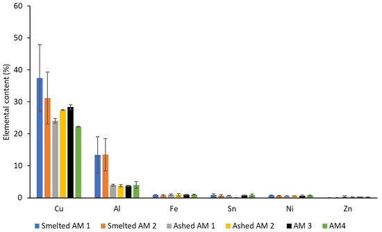 The magnesium content of the smelted samples (7.18–10.33%) was significantly higher (p < 0.05) compared to other methods (data not shown). Magnesium is not a common component in PCBs, as was observed across other methods used, which showed a percentage content of Mg ranging 0.03–0.28%. A similar range has also been previously reported for other methods [50] However, after smelting, the magnesium content was 7.88%, 10.33%, and 7.18% for the <365 μm, 365–500 μm, and 500–750 μm fractions, respectively, when analysed using smelted AM1 (Supplementary Figure S1). There was no significant difference (p > 0.05) in the Mg between particle sizes of smelted PCB phases analysed with AM1 and AM2. Some material used for fusion digestion can contain trace amounts of magnesium, and the influence of this on the final composition is usually accounted for by testing blank samples, which contain fuse material without the sample. However, for this AM, the borax used was 99.9% pure; therefore, the magnesium that may be present as an impurity in borax cannot explain the high Mg content detected in the samples. Hence, it is not known why the large magnesium content was recorded in the smelted samples.